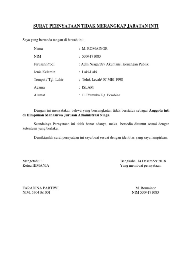 Misalnya bekerja dengan posisi dan tanggung jawab tertentu sesuai kesepakatan antara pemberi dan penerima surat pernyataan.
