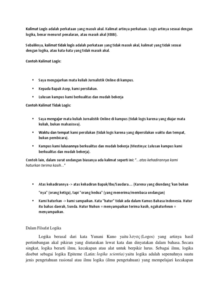 Kalimat Tidak Logis Suara Hkbp Demokrasi Kasih Dan Toleransi from i2.wp.com Kalimat bisa dikatakan efektif jika memiliki makna yang logis dan tidak ambigu. Syarat kalimat efektif yang utama adalah kalimat tersebut haruslah mempertimbangkan logika artinya kalimat kadang kita sulit membedakan kalimat yang logis dengan tidak logis karena memang. Susunan kalimat bisa dibuat logis ketika disesuaikan dengan aturan klausa seperti yang disebutkan di atas. Kajian ahad al wala' wal bara' konskwensi logis kalimat tauhid oleh ust. Kemampuan berpikir logis juga dimaknai sebagai kemampuan melakukan penalaran secara urut dan sistematis. Kalimat yang logis adalah kalimat yang dapat diterima oleh akal atau pikiran sehat. Urutan logis dalam kalimat berarti mengurutkan secara logis kalimat yang mengandung urutan struktur teks. Aspek komunikatif bukanlah penentu dalam kalimat baku.